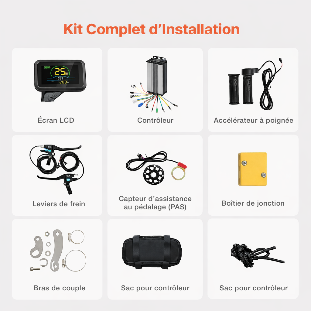 Oui. Le pack inclut tous les éléments nécessaires : roue motorisée, contrôleur, écran LCD, accélérateur, capteur PAS, câbles et accessoires. Aucun achat supplémentaire n’est requis.