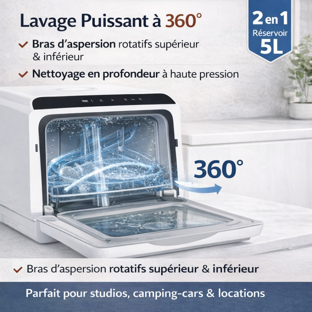 Ce mini lave-vaisselle compact offre un lavage puissant à 360° grâce à ses bras d’aspersion rotatifs.